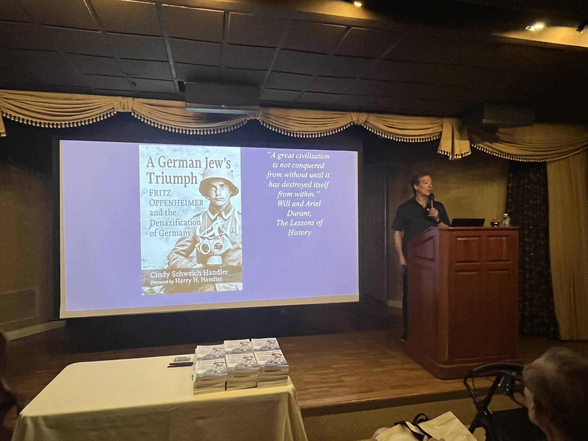 Supreme Headquarters Allied Expeditionary Force Reunion, Susan Eisenhower (Dwight Eisenhower’s granddaughter) 2nd from right holding A German Jew’s Triumph, Harry Handler (Fritz Oppenheimer’s grandson) right